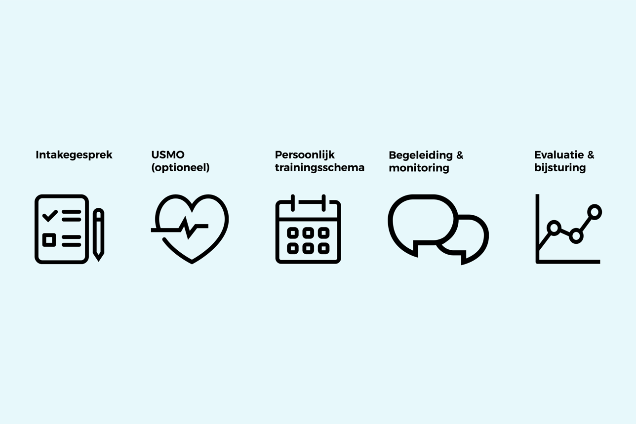 Wil je nóg gerichter trainen? Dan kun je bij aanvang kiezen voor een Uitgebreid Sport Medisch Onderzoek (met korting, voor €400,-). Met deze meting krijg je inzicht in je gezondheid, fitheid en persoonlijke hartslag- en/of vermogenszones. Je leert waar je sterke punten liggen, waar nog winst te behalen is en hoe jouw lichaam reageert op inspanning. Zo kunnen we nog slimmer, veiliger en effectiever trainen.